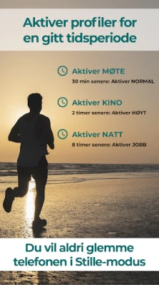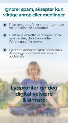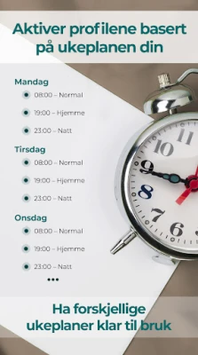 Lydprofiler løfter automatisering til nye høyder. Du kan etablere smarte tidsplaner som sømløst veksler mellom profiler gjennom uken – fra en dynamisk morgenprofil til en fredfull kveldsprofil. Trenger du en rask pause? Aktiver enkelt en midlertidig profil for en lur eller et kort møte. Appen integreres sømløst med din digitale verden, og kan bytte profil basert på om du kobler til bilens Bluetooth, ditt hjemmenettverk, befinner deg på arbeidsplassen, eller hva kalenderen din tilsier. Gjentatte anrop kan innstilles til å bryte gjennom stille modus, slik at du aldri går glipp av noe kritisk, samtidig som uønsket støy filtreres bort.