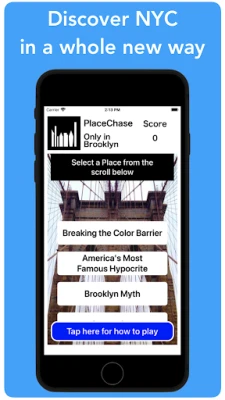 Dykk ned i hjertet av Amerikas første forstad med PlaceChase Only in Brooklyn – en helt unik skattejakt som forvandler din utforskning til et uforglemmelig eventyr. Enten du er ute med familien, venner, på en romantisk date, eller foretrekker en soloekspedisjon, gir denne appen deg friheten til å oppdage Brooklyns rike historie, blendende landemerker og skjulte perler i ditt eget tempo. Alt du trenger er din smarttelefon eller nettbrett for å låse opp bydelens fascinerende fortellinger og skape nye, varige minner.