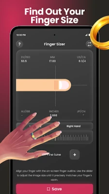 Uansett hvor i verden du befinner deg eller hvor dine smykker er fra, gir Ring Sizer deg full trygghet. Appen støtter et omfattende utvalg av internasjonale størrelsesstandarder – fra USA og Storbritannia til Europa, Australia, Japan og Kina – slik at du trygt kan handle globalt. For å finne din egen ideelle ringstørrelse, opplev den innovative Fingerstørrelses-funksjonen. Plasser enkelt fingeren på skjermen, og appen vil umiddelbart vise deg din nøyaktige størrelse i sanntid; raskt, enkelt og utrolig presist.
