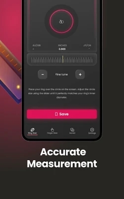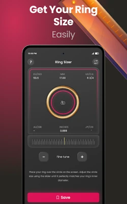 Dine ringer fortjener å føles like fantastiske som de ser ut. Med Ring Sizers presise mål trenger du aldri mer å bekymre deg for en ring som ikke sitter som den skal. Oppnå en feilfri passform som forbedrer komforten og skjønnheten til dine diamant- og edelstensringer. Glem bryderiet med manuell notering; Ring Sizer lagrer all din målehistorikk. Enten du planlegger et nytt kjøp eller bare ønsker å sjekke en tidligere størrelse, er dine data alltid lett tilgjengelige med et enkelt trykk.